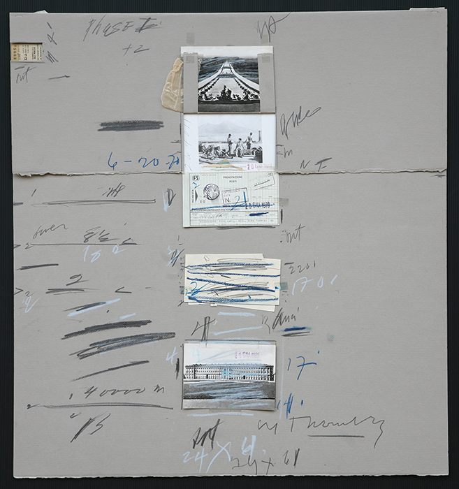 Cy Twombly, Untitled, 1970. Collage of postcards, tickets, and tape, with wax crayon, graphite, and ink on paper, 29 1/2 × 27 5/8 in. (75 × 70.1 cm). The Menil Collection, Houston, Gift of the Cy Twombly Foundation. © Cy Twombly Foundation