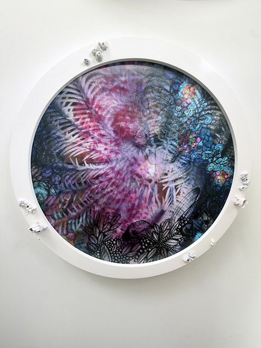 Janavi Mahimtura Folmsbee, Take Us to the Zoanthids on Malabar Hill at PDP, lenticular mixed-media photograph with oil, drawing, and porcelain, 30 x 2.25 inches. Image courtesy of the artist.