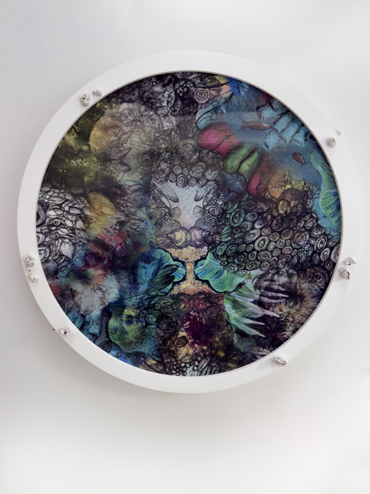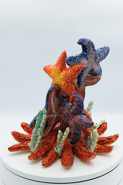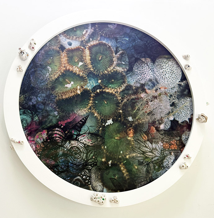 Mahimtura Folmsbee has fashioned more than 100 anemones, oysters, and sea stars from porcelain and fired them in a rainbow of colors. There are nine lenticular pieces embellished with oil and drawing that she has created from her astonishing underwater photography. Each piece is a composite of two or three images that shift as your point of view changes. A porcelain stack of sea stars titled When Stars Soar twinkles with tourmalines, emeralds, and peridots as it rotates slowly on its base. Continuum Treasures replicates the ocean floor with an assortment of pastel-colored porcelain organisms nestled together.