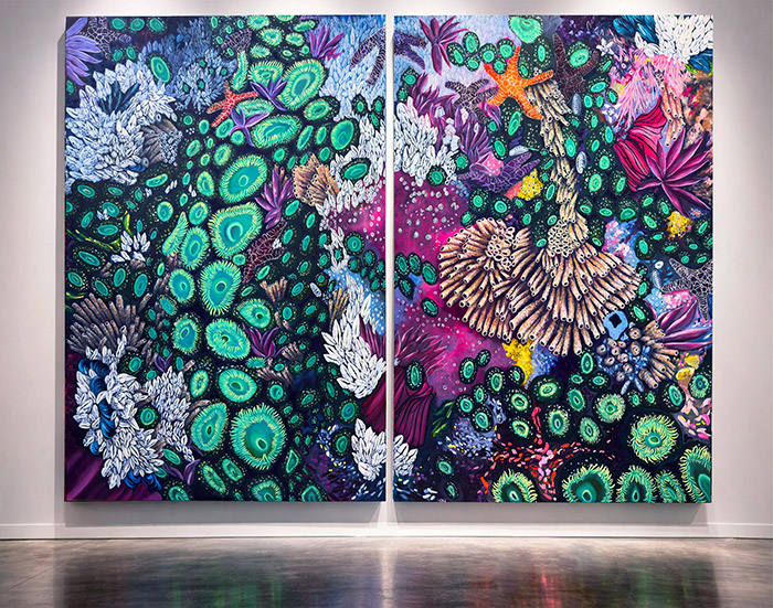Several large marine paintings offer a glimpse into what Mahimtura Folmsbee sees when diving. In the diptych Wise Whispering Barnacles on Water, dozens of coral, starfish, anemones, and other sea creatures convey the exhilarating experience of diving. “I love to paint,” Mahimtura Folmsbee said. “It gives me the same peace I get when diving.”