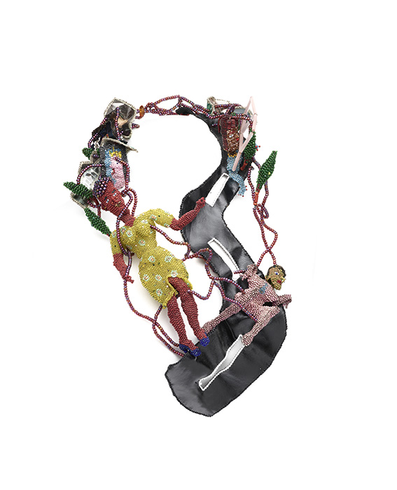 Joyce J. Scott, Run Down on the Highway of Love necklace, 1986, glass beads, leather, plastic, wire and photographs, Dallas Museum of Art, Discretionary Decorative Arts Fund, 2022.61. © Joyce J. Scott / Courtesy Goya Contemporary and Mobilia Galleries. Photo by Chad Redmon, courtesy Dallas Museum of Art.