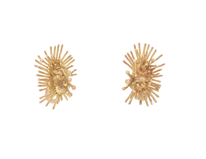 Velma Davis Dozier, Burr ear clips, 1958, gold, Dallas Museum of Art, Neiman-Marcus Purchase Prize, 10th Annual Texas Crafts Exhibition, 1958, 1958.56.A-B. © John Howard Washburn, Jr, Davis Madeleine Washburn Griffin, and Robert Miegel Jr. Photo by Chad Redmon, courtesy Dallas Museum of Art.