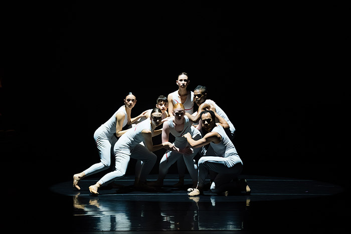 Pegasus Contemporary Ballet members: Aia McInnes, Elena Olshin, Natalie Panayi, Elijah Lancaster, Emma Krusling, Kiera Mays, and Dominiq Luckie in From A Beating Heart, choreography by Bruce McCormick, music by Martin Morgan. Photo by DFW Dance Photography.
