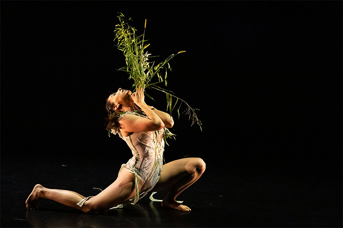 NW: I am pondering Paty Lorena Solórzano standing still with sprigs of unruly weeds attached to most of her body. The slight sway of plant matter caught my attention before she made a single movement in La Maleza, performed as part of the culmination of her Dance Source Houston Artist in Residence project. Solórzano draws a parallel between being an immigrant and an invasive species, leaning into the lessons of weeds in survival, resistance and adaptability. She is dancing fully in this moment where both citizenship and the natural world are both in peril.