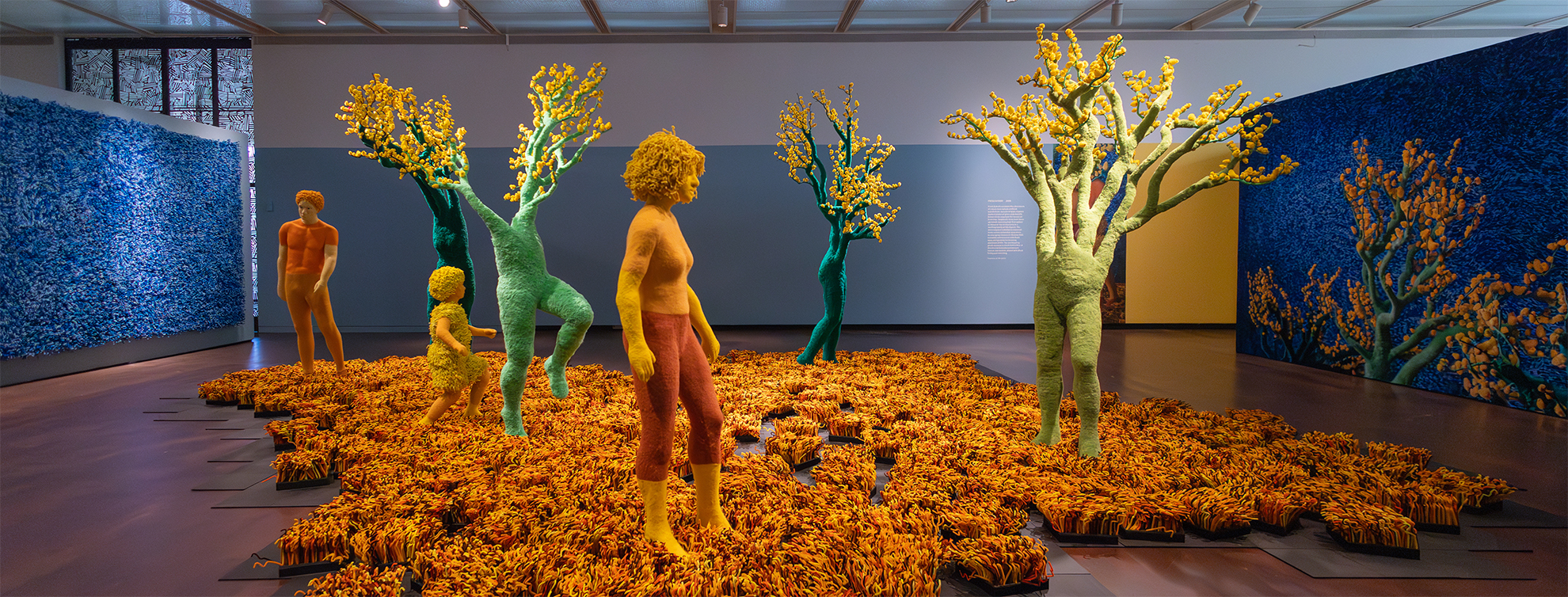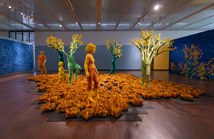 Over the years, she’s appeared in group shows there, but Enchanting Nature is their most extensive collaboration yet, anchored by three installations: Radioactive Cats (1980), Revenge of the Goldfish (1981), and the debut of Fresh Hybrid (2008).