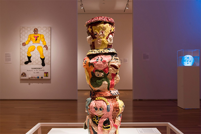 Trenton Doyle Hancock’s plastic dolls sit beneath a row of framed drawings, their glossy surfaces glowing under the gallery lights. Each figure, brightly colored and encased in patterned boxes, looks equal parts collectible toy and uncanny idol. Their bulbous forms and exaggerated features echo anime’s elasticity, characters that seem forever poised between innocence and excess. Positioned within a section of the exhibition that explores merchandising and the economics of fandom, Hancock’s work exposes the tension between creation and consumption, art and commodity. The dolls may invite affection, but they also confront viewers with the machinery of desire that powers pop culture itself.