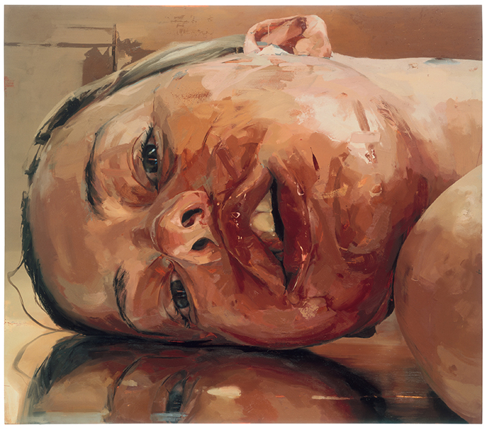 The painting Rosetta II (2005–06) portrays an opaque-eyed young adult, head tilted back and off to one side, with an institutional blue-green-grey backdrop. It may be amusing to think of this posture as one we embody after a long day in front of the computer, blinded by blue light. But the portrayal is all the more poignant—even horrifying—when we consider contemporary cultural habits that deaden our senses. We look at images all day long but no longer recognize what’s real. Reverse (2002-2003), with its head-on-the-floor perspective, makes eye contact a strained and unrewarded effort. Mouth agape, slouched, and wet, the subject’s head lies on a reflective surface with visible dead weight, as though after a collapse.