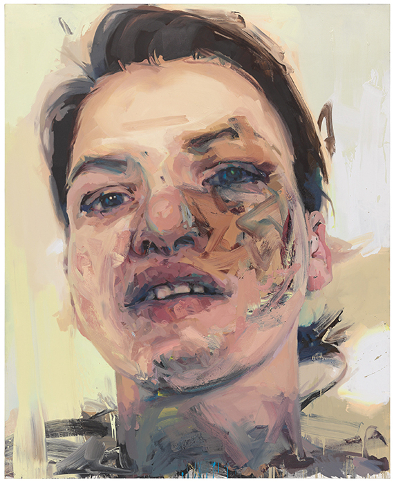 Rather than seamlessly rendered, Saville’s painted faces and figures are physically built up with oil pigment, layered similarly to how the muscles, fat, veins, blood, and skin comprise the body. Saturated blues, reds, and yellows live amidst familiar olives, pinks, and browns that keep human flesh and its complexities ever-present.