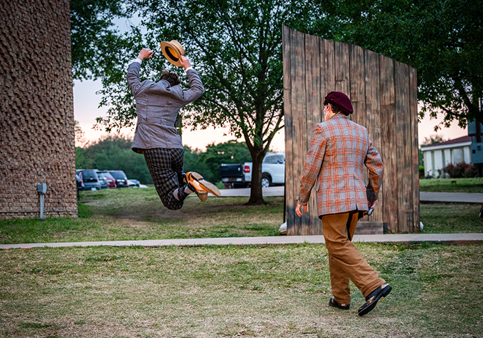 Andrew Mueller as Sir Andrew Aguecheek and Coleman Hahn as Sir Toby Belch in the St. Edwards University production of Twelfth Night, directed by Ben Wolfe. Photo by Brenda Ladd Photography.