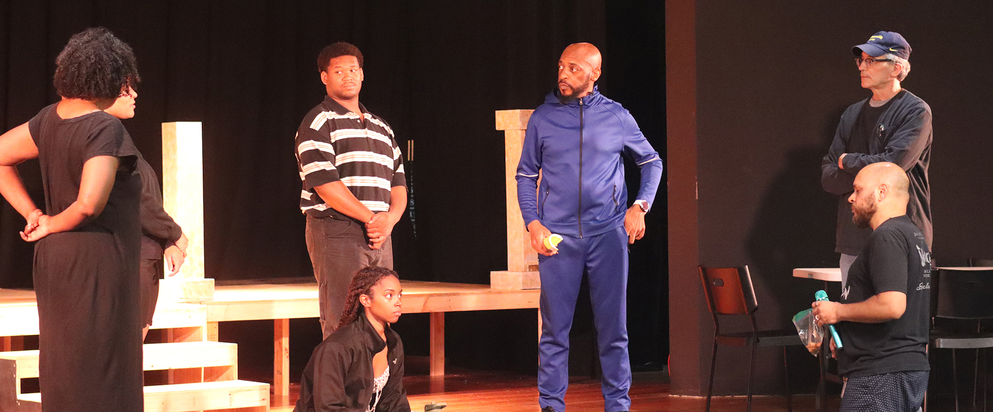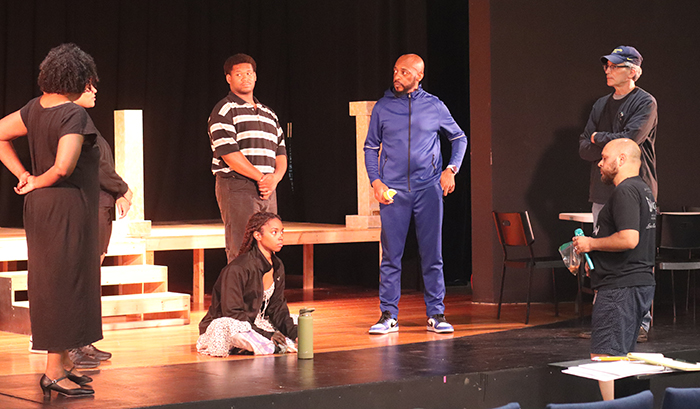 Director Ben Wolfe discussing a scene with the cast and crew of Fat Ham at Austin Playhouse. Photo by Sarah Chong Dickey.