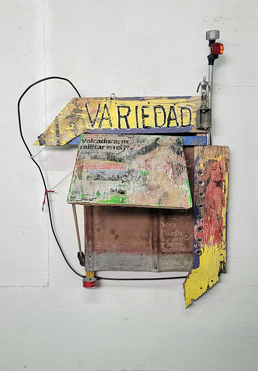 For now, Galveston offers the inverse: a white room, a clear field, a setting where a work from 2021 can face one made last week and their conversation can be overheard. The studio in Laredo is crowded; a freight line runs so close the passing train occasionally interrupts the internet and, for a moment, the sentence. In the gallery, the clatter falls away. Quieter elements sound out: a sunburnt plank cut just crooked enough to feel alive; the soft rasp of a plastic bag; a scrap of hand-painted typography refusing to fade; an eagle no longer guarding a victory so much as blessing a persistence.